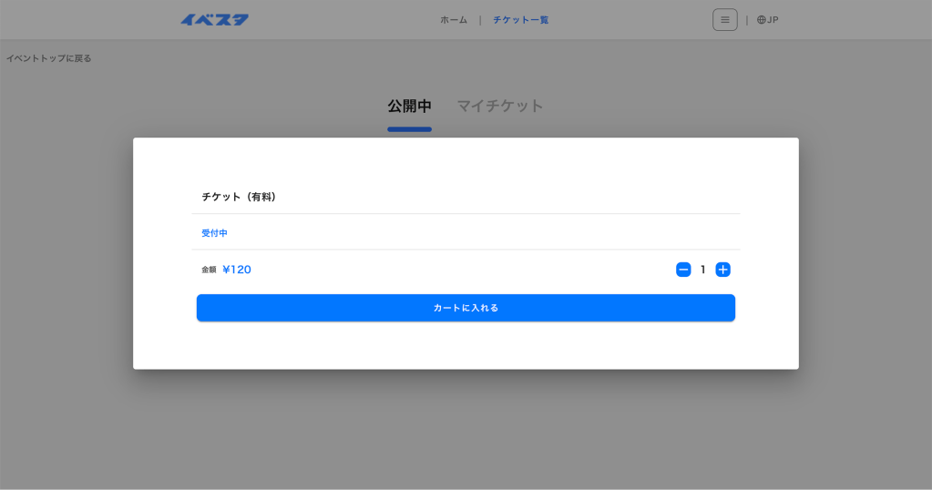 チケットを選択、プラス・マイナスボタンで枚数を指定し、カートに入れるボタンを押します。