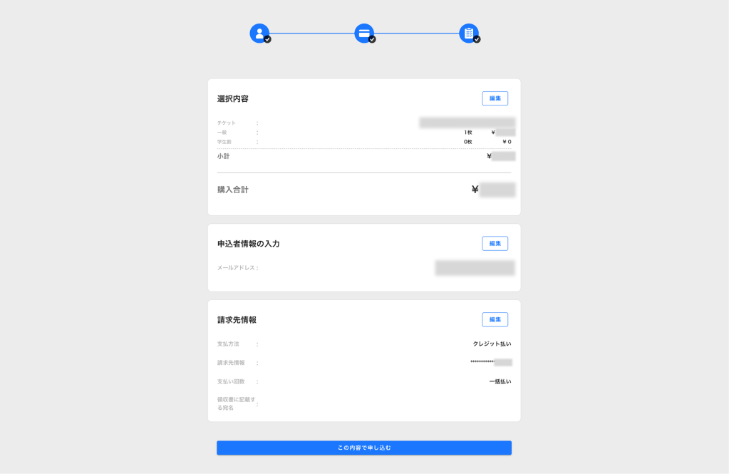 情報入力が完了しますと、購入内容の確認ページに進みますので、内容をご確認の上、この内容で申し込むに進みます。