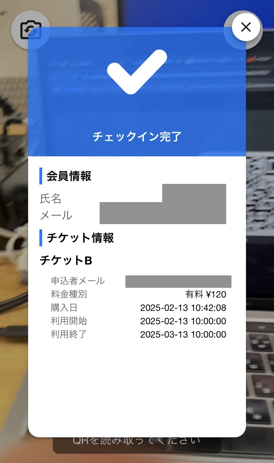 受付スキャナーでQRコードを読み込むことで、受付時の挙動を確認できます。