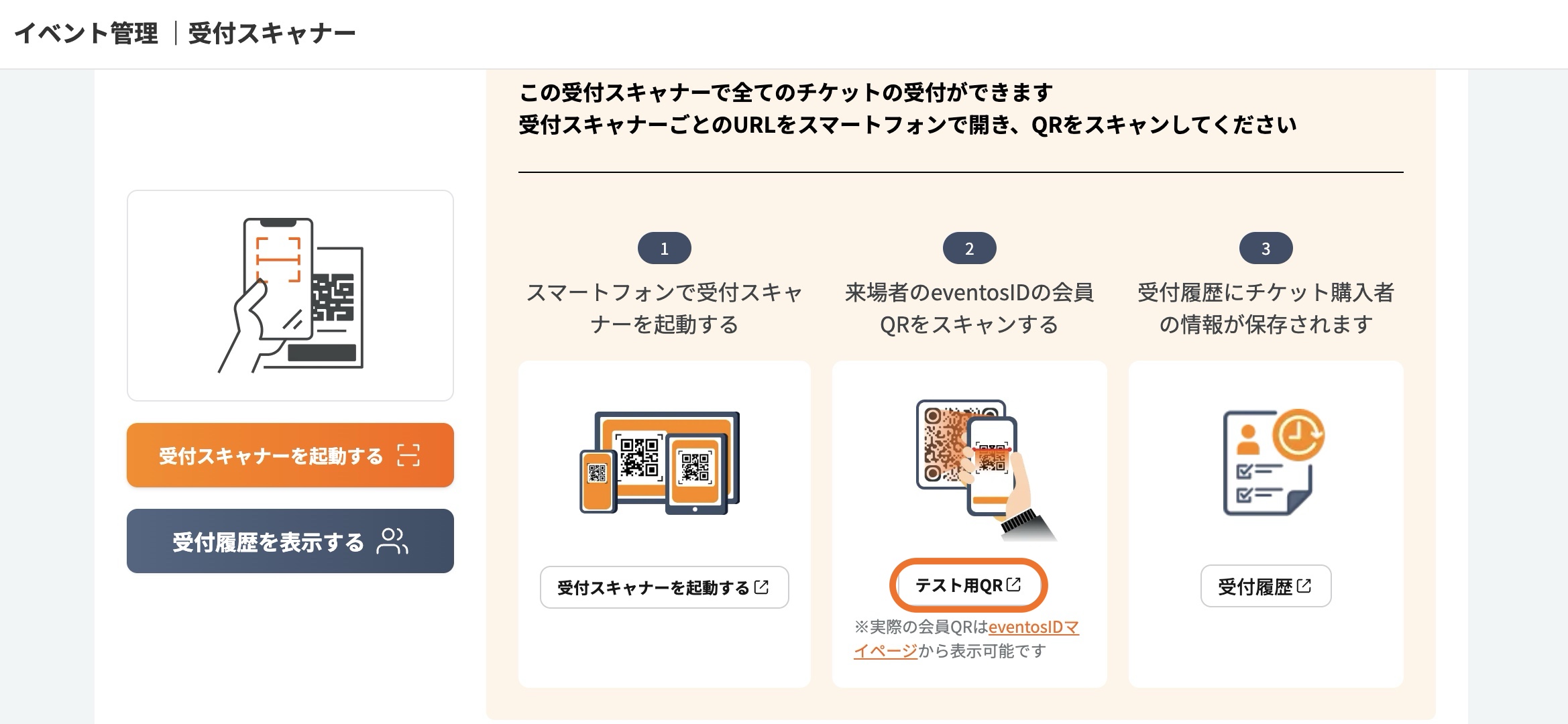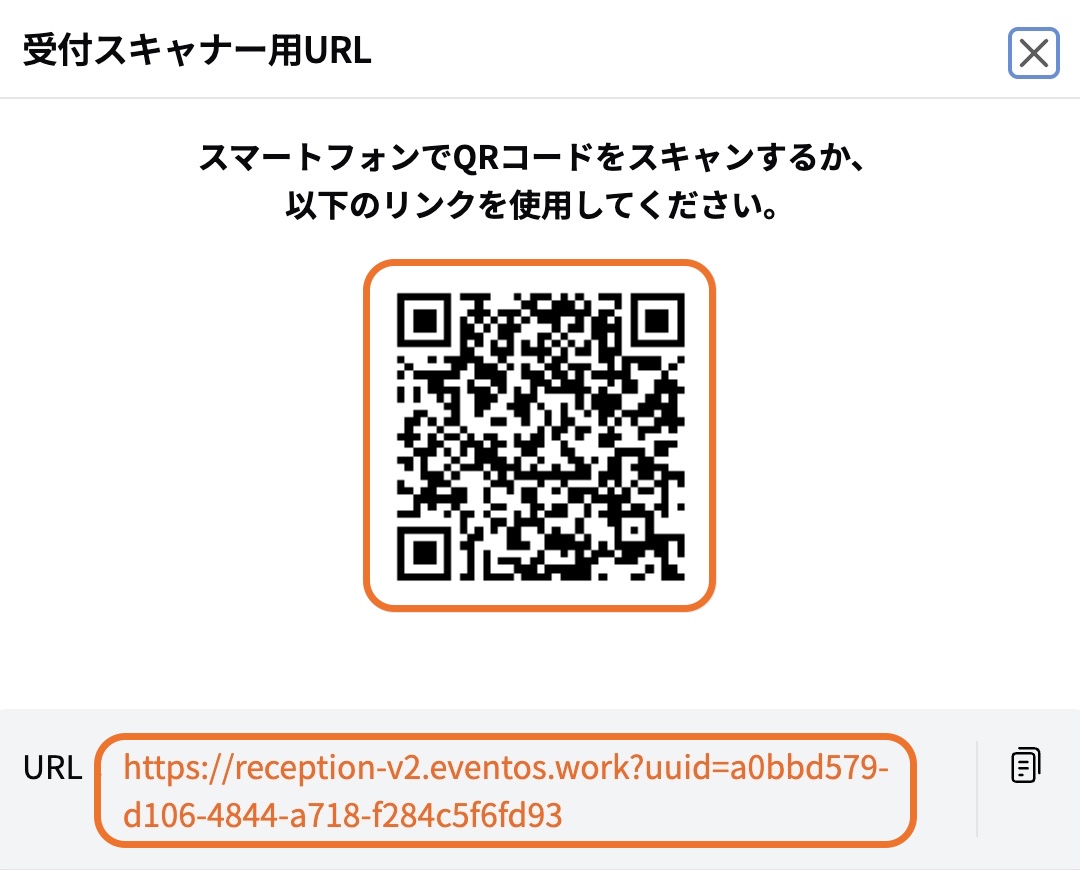 QRコードをお手持ちのスマホで読み込むか、URLを開いて受付スキャナーを起動できます。